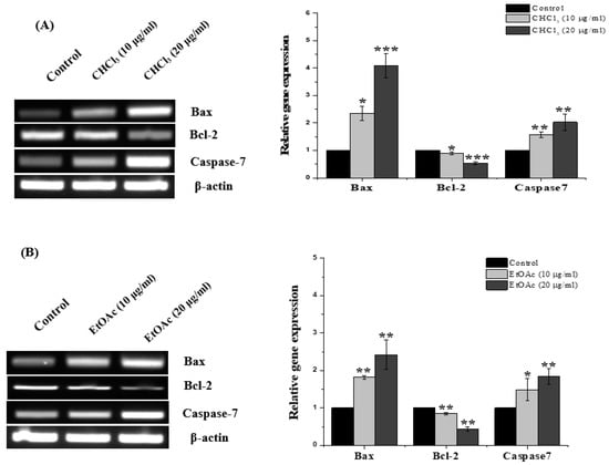 To determine the apoptotic actions of the CHCl3 and EtOAc fractions against the MCF-7, the gene-expression levels of the proapoptotic (Bax and caspase-7) and antiapoptotic (Bcl-2) genes were estimated after exposing the cells to 10 and 20 μg/mL of the fractions. The mRNA expression of the antiapoptotic Bcl-2 was reduced after exposure to the CHCl3 and EtOAc fractions (Figure 7A,B). In contrast, the proapoptotic Bax significantly increased (2.34 ± 0.46 and 4.09 ± 0.44-fold), as did he caspase-7 (1.57 ± 0.11 and 2.02 ± 0.2-fold), following treatment with the CHCl3 fraction at 10 and 20 μg/mL, respectively. In the same manner, the upregulation of Bax (1.81 ± 0.04 and 2.41 ± 0.39-fold) and caspase-7 (1.48 ± 0.29 and 1.83 ± 0.21-fold) was observed when using the EtOAc treatment at the indicated concentrations.