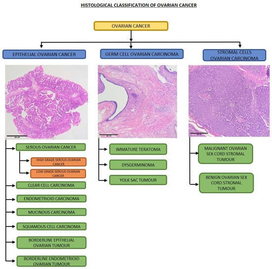 Ovarian cancers originate from different cells of the ovary and are a lethal gynecological malignancy with a high mortality rate in women. There are more than 30 types of ovarian tumors based on cellular origin, but the main four types of ovarian tumors include epithelial tumors that develop from the epithelial cells of the ovary, tumors that originate from the ova, tumors that develop from the stromal cells and the extremely rare small cell carcinoma of the ovary (SCCO). They are further classified based on the tissue origin, such as epithelial (7seventypes), germ cell (three types) and stromal cells (two types). Epithelial ovarian cancer (EOC) and its subtypes, high-grade serous cancer (HGSOC) and low-grade serous cancer (LGSOC), dominate the histological types of ovarian cancer (Figure 1). Ovarian cancer accounts for 4% of all cancers in women [1]. According to the American cancer society (2022), women with localized epithelial, stromal and germ cell ovarian carcinomas have a survival rate ranging from 95% to 98%, women with regional metastasized ovarian carcinoma have a survival rate of 75% to 94%, and women with distant metastasized ovarian carcinoma have a survival rate from 31% to 74%. The main symptoms of ovarian cancer include abdominal swelling, abdominal blotting, pelvic pain, and weight loss. Even though there are multiple symptoms of ovarian cancer, this cancer often remains undetected since most of the symptoms overlap with those of abdominal or gastrointestinal diseases and is hence diagnosed in the late stages, which accounts for its lethality [2].
