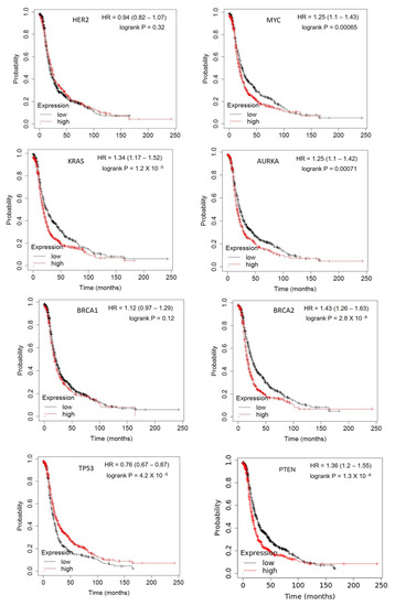 Like most human malignancies, ovarian carcinoma occurs due to the accumulation of mutations in the genes that regulate growth and control cell division and proliferation. Two of the most important classes of genes that regulate cell growth and proliferation are oncogenes and tumor suppressor genes. Activation of an oncogene together with an inactivation of a tumor suppressor gene leads to carcinogenesis. Figure 2 represents the overall survival rate of the ovarian cancer patients who are having mutations in the major oncogenes and tumor suppressor genes using online tool Kaplan–Meier plotter [20]. Furthermore, there is progressive accumulation of additional somatic driver mutations that contribute to clonal evolution of the tumor, leading to metabolic adaptations and epithelial to mesenchymal transition. Table 1 lists the genes that have been implicated in the pathogenesis and progression of ovarian cancers. The frequency of somatic and germline mutations was obtained from the cBioportal web server [21].