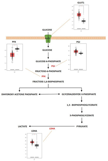 Glucose is an important molecule that plays a central role in the energy generation since the oxidation of glucose carbon dioxide and water results in a standard free-energy change of −2840 kJ/mol. Glycolysis is considered an important metabolic pathway that breaks down glucose into two three-carbon compounds. During this process, free energy is released in the form of high-energy deriving molecules such as adenosine triphosphate (ATP) and reduced form of Nicotinamide Adenine Dinucleotide (NADPH). The process of glycolysis is a series of enzyme-catalyzed reactions to yield two molecules of pyruvate. Glycolysis is initiated when glucose is phosphorylated at the hydroxyl group of C-6. It consists of two phases: (i) preparatory phase where two molecules of ATP are invested, and (ii) payoff phase where energy is gained. Glycolysis occurs in the cell cytoplasm under anaerobic conditions. Cancer cells undergo a modified form of glycolysis called aerobic glycolysis or the Warburg effect in which the cells rapidly proliferate and there is an increased glucose uptake and lactate production even in the presence of oxygen [67]. Figure 3 shows the differentially expressed proteins in the glycolysis pathway, represented as boxplots obtained from GEPIA web server uploaded by Zhang et al., 2017 [68]. Almost 60% of the ATP is generated by tumor cells in the presence of aerobic conditions through glycolysis [69]. The Warburg effect has been shown to play a role in progression of ovarian cancer. A study conducted by Teng et al. showed silencing of AKT2 (AKT serine/threonine kinase 2) and AKT3 (AKT serine/threonine kinase 3), isoforms of AKT which are a downstream mediator of PI3K signaling pathway, was determined to regulate the Warburg effect in EOC [70].