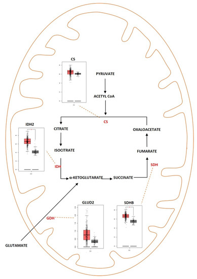 Differentially expressed proteins of the TCA cycle in ovarian cancer. Schematic representation highlighting the differentially regulated genes of the TCA cycle in ovarian cancer. (CS; overexpressed, IDH2; overexpressed, SDHB; overexpressed, GLUD2; overexpressed). Boxplot derived from TGCA expression datasets with tumor (red) and control (gray). * Represents statistical significance of p < 0.05.