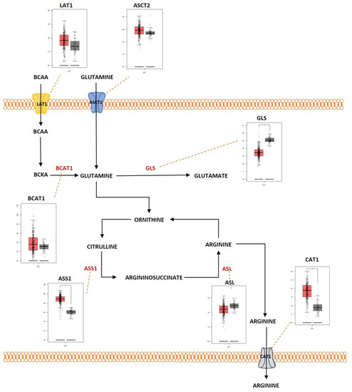 Differentially expressed proteins of the glutamine metabolic pathway in ovarian cancer. Schematic representation of the glutamine metabolic pathway in ovarian cancer that highlights the differentially regulated genes (LAT1; overexpressed, ASCT2; overexpressed, BCAT1; overexpressed, GLS; overexpressed, ASS1; overexpressed, ASL; underexpressed; CAT1; overexpressed). Boxplot derived from TGCA ex-pression datasets with tumor (red) and control (gray). * Represents statistical significance of p < 0.05.
