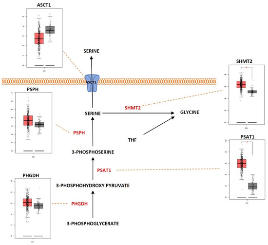 Differentially expressed proteins of the serine metabolic pathway in ovarian cancer. Schematic representation of the serine metabolic pathway that highlights the differentially regulated genes in ovarian cancer (ASCT1; underexpressed, SHMT2; overexpressed, PSPH; overexpressed, PSAT1; overexpressed, PHGDH; overexpressed). Boxplot derived from TGCA expression datasets with tumor (red) and control (gray). * Represents statistical significance of p < 0.05.