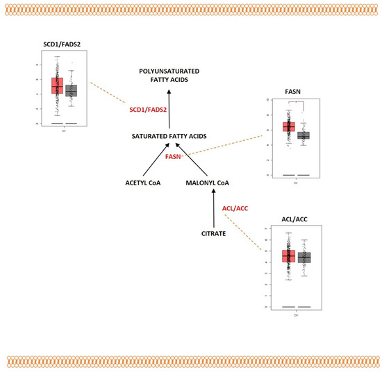 Differentially expressed proteins of the fatty acid metabolic pathway in ovarian cancer. Schematic representation of fatty acid metabolic pathway in ovarian cancer and highlight of key differentially regulated genes (SCD1/FADS2; overexpressed, FASN; underexpressed, ACL/ACC; overexpressed). Boxplot derived from TGCA expression datasets with tumor (red) and control (gray). * Represents statistical significance of p < 0.05.