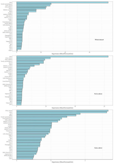 A machine-learning feature-selection approach, the random forest (RF), was employed to identify the most predictive features in the dataset for the sarcopenic condition considering every possible interaction between them, considering also the non-linear relationships that classical models could not assess (Figure 1). Three RF regression models were built. The first model also included the variables used for the detection of sarcopenia in order to assess which variables were most important in the algorithm of detection using the Mean Decrease Gini. The variables SMI and SPPB were used within an ensemble learning approach in order to highlight possible relationships even in light of variables known to be associated with the condition of sarcopenia. Such an inclusion is therefore useful in order to highlight possible interactions of a nonparametric nature between predictive factors in the classification of sarcopenia. The second RF regression model was performed subdividing according to the clinical study centre in order to assess if there were differences in the association ranking due to the clinical setting. A third RF regression was performed using only socio-demographic and haematochemical variables in order to assess which variables were most associated with the sarcopenia condition using the Mean Decrease Gini (Figure 2).
