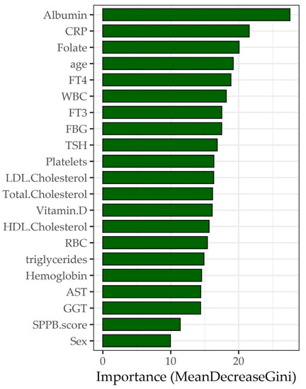Figure 1 shows a plot of important variables from the RF regression model with sarcopenia condition as the dependent variable and the other variables as regressors. The following rationale guided the selection procedure. The first model was run including both the fluid markers and the functional domains of sarcopenia to evaluate which variables were the most important to be included in the algorithm of sarcopenia detection by using the Mean Decrease Gini. The graph showed that SMI (Mean Decrease Gini greater than 60), followed by handgrip strength, FFM (arms and legs), sex (all showing a 20 to 40 Mean Decrease Gini), BMI, and total lean body mass (Mean Decrease Gini over 15) were the most relevant. The second RF regression model was run separately after dividing the sample into two subsets according to the population setting (northern vs. southern Italy, i.e., clinical vs. population-based setting) to assess whether there were differences in the importance ranking due to the different settings. Here, the ranking showed almost overlapping findings, that is, SMI, handgrip strength, FFM (legs and arms), and sex being the top variables of importance in both subsets. A third RF regression was performed using only the socio-demographic and haematochemical variables to assess which variables were most associated with the condition of sarcopenia in the total sample. Here, albumin, CRP, and folate were shown to be top-ranked (Mean Decrease Gini: 27.5, 21.56, and 20.08, respectively) (Figure 2). The reliability of the third RF regression model was evaluated using a confusion matrix (Table 3). The findings showed an accuracy of 94.57 (95%CI 92.15 to 96.42), a sensitivity of 1.00, and a specificity of 0.94.