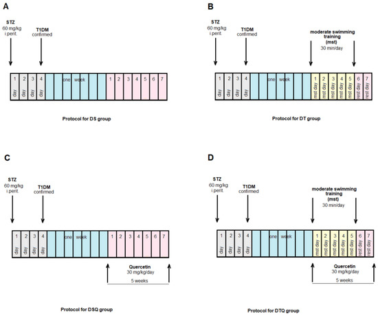 The time course of scheduled experiment for the groups of rats with T1DM: (A) diabetic sedentary rats (DS group); (B) diabetic trained rats, 30 min/day, 5 days/week for 5 weeks (DT group); (C) diabetic sedentary rats treated with quercetin 30 mg/kg/day, for 5 weeks (DSQ group); (D) diabetic trained rats, 30 min/day, 5 days/week and treated with quercetin 30 mg/kg/day, for 5 weeks (DTQ group).