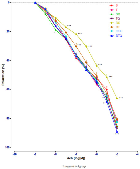 The aorta rings relaxation responses to cumulative concentrations of acetylcholine (Ach) (10−9–10−5 M) in: sedentary, untreated animals (S); trained, untreated animals (T); sedentary animals, treated with quercetin (SQ); trained animals, treated with quercetin (TQ); diabetic, sedentary, untreated animals (DS); diabetic, trained, untreated animals (DT); diabetic, sedentary animals, treated with quercetin (DSQ) and in diabetic, trained animals, treated with quercetin (DTQ). The relaxation responses are expressed as percentages of relaxation from an induced maximal contraction at PE. The values are expressed as mean ± SEM (* p < 0.05; ** p < 0.01; *** p < 0.001 compared to S group).
