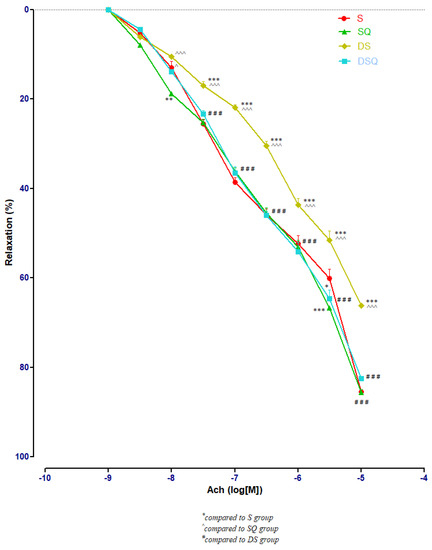 The aorta rings relaxation responses to cumulative concentrations of acetylcholine (Ach) (10−9–10−5 M) in: sedentary, untreated animals (S); sedentary animals, treated with quercetin (SQ); diabetic, sedentary, untreated animals (DS); diabetic, sedentary animals, treated with quercetin (DSQ). The relaxation responses are expressed as percentages of relaxation from an induced maximal contraction at PE. The values are expressed as mean ± SEM (* p < 0.05, ** p < 0.01, *** p < 0.001 compared to S group; ^ p < 0.05, ^^^ p < 0.001 compared to SQ group; ### p < 0.001 compared to DS group).