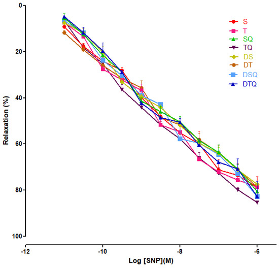 The relaxation responses of the aorta rings, precontracted with phenylephrine (PE), to cumulative concentrations of sodium nitroprusside (SNP 10−11 to 10−6 M) in: sedentary, untreated animals (S); trained, untreated animals (T); sedentary animals, treated with quercetin (SQ); trained animals, treated with quercetin (TQ); diabetic, sedentary, untreated animals (DS); diabetic, trained, untreated animals (DT); diabetic, sedentary animals, treated with quercetin (DSQ) and in diabetic, trained animals, treated with quercetin (DTQ). The relaxation responses are expressed as percentages of relaxation from an induced maximal contraction at PE. The values are expressed as mean ± SEM.