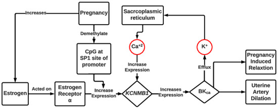 Schematic overview of the role of estrogen, Ca+2, and K+ in the establishment of pregnancy-associated relaxation and myogenic tone reduction. Pregnancy increases the basal estrogen level and demethylate CpG at the Sp1 promotor site to increase KCNMB1 expression [61]. KCNMB1 leads to opening of BKca channels, causing efflux of K+ and release of Ca+2, which further promote KCNMB1 expression [59]. Change in membrane potential of vascular smooth muscle in the uterine artery by efflux of K+ and release of Ca+2 results in uterine artery dilation along with pregnancy-induced relaxation [61]. KCNMB1, potassium calcium-activated channel subfamily M regulatory Beta subunit 1; BKCa, large-conductance Ca+2-activated K+ channel receptors.