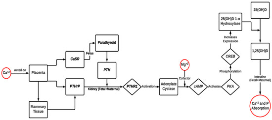 The transport and regulation of some macrominerals such as magnesium, calcium, and phosphorous are interlinked and are affected by the availability of each in the maternal diet (Figure 4). Calcium from blood plasma interacts with the calcium-sensing receptor (CaSR) at the placenta and increases the expression of placental parathyroid hormone-related proteins (PTHrP) and the release of parathyroid hormone (PTH) from the fetal parathyroid gland [105,113]. PTHrP expression increases in the maternal mammary tissues of humans; thus, both calcium-associated mechanisms run parallel in the fetal and maternal systems [111]. Both PTH and PTHrP from the fetus and PTHrP from the dam act on PTH receptor 1 (PTHR1) of the kidney both in the fetus and dam, which activates cyclic adenosine monophosphate (cAMP)-associated pathways and requires Mg+2 as a cofactor [109,110]. The cAMP-associated pathways increase the expression of 25(OH)D(3)-1-α hydroxylase, which then increases calcitriol production from 25(OH)D3, resulting in calcium and phosphorous absorption from the intestine [110,111]. Based on these mechanisms, the deficiency of any of these minerals—magnesium, calcium, or phosphorous—will affect the availability of each other and, ultimately, affect bone mineralization and development in the fetal and maternal systems.