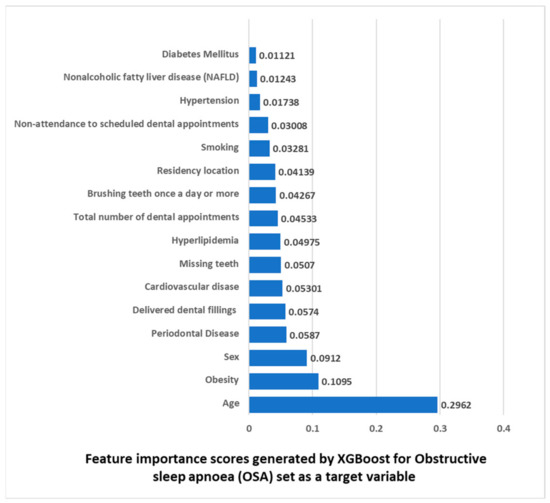 Feature importance scores generated by XGBoost for Obstructive sleep apnea (OSA) as a target variable.