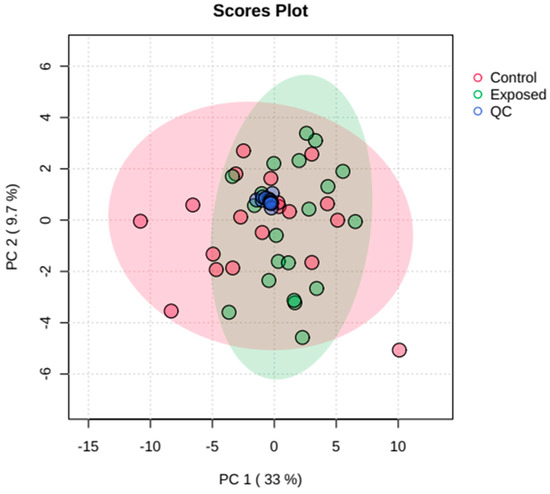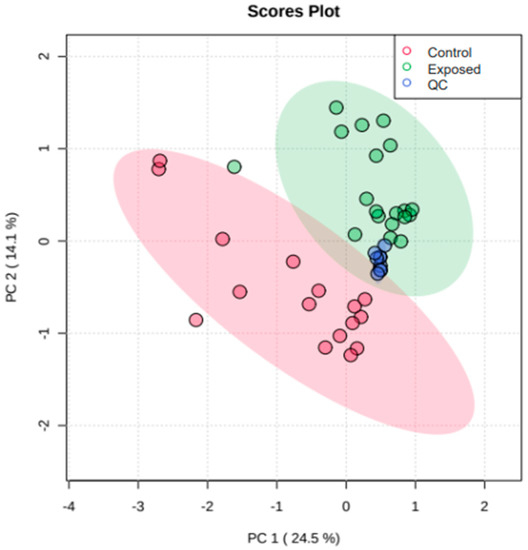 Urine samples were prepared according to the sample preparation methodology previously described and were analyzed under the same analytical conditions, randomly, with QC samples interspersed every 5 urine samples. After the processing step (deconvolution, grouping and alignment), the data were normalized by urinary creatinine, a recommended procedure to correct the effect of variable dilutions in specific samples [59]. In sequence, they were subjected to multivariate analysis techniques. Initially, principal component analysis (PCA) was applied to all samples, including the QCs, to assess a possible separation between groups of individuals occupationally and non-occupationally exposed to pesticides. The developed model is represented in Figure 5 and shows a weak separation between the groups, but a rigorous grouping of the QCs revealed analytical stability and good quality of the acquired data.