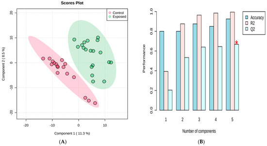 The results were then evaluated by the supervised pattern recognition method discriminant partial least squares analysis (PLS-DA) to model the differences between the metabolites responsible for the separation of groups. The score graph (Figure 2) shows an effective separation between the plasma samples from the control group versus the exposed group. In order to test the validity of the constructed model, a cross-validation test was carried out, which can be seen in Figure 2B. The cross-validation results were R2 = 0.98, Q2 = 0.92, which shows an adequate fit of the data to the model, and therefore it is considered a highly accurate model. Usual values for biological experiments are Q2 > 0.4 and R2 > 0.7 [26,27].