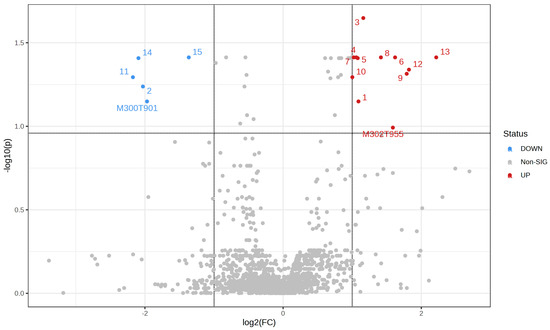 Volcano plot applied to data from plasma samples of individuals exposed and not exposed occupationally to pesticides. Note: each point on the plot represents a molecular feature. The red dots indicate an increase in features in the control group and the blue dots, a decrease in the same group. The gray dots represent a lack of distinction between the groups. The dots identified by numbers correspond to the compounds listed in Table 2.