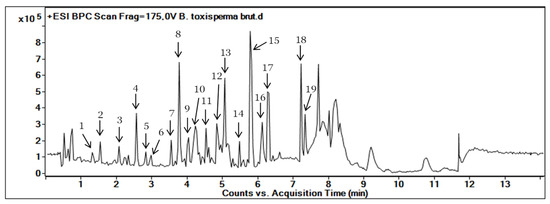 Figure 1 shows the BPC (Base Peak Chromatogram) of the ethanolic extract of B. toxisperma obtained with HPLC-UV-MS in positive ion mode. This chromatogram allowed us to visualize the majority of the chromatographic peaks on broad polarity ranging from 5 to 100% of organic solvent.