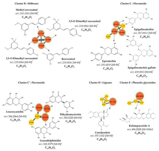 The molecular network was visualized using Cytoscape 3.9.0 software. This molecular network contained one large cluster and sixteen small clusters (number of nodes n ≥ 3) that could be linked into molecular families or groups (Figure 2). As well as the manual exploitation of the MS/MS data, these results highlighted the presence of five major molecular families in the extract of B. toxisperma: phenylpropanolamines (cluster A), stilbenes (cluster B), flavonoids (cluster C and C’), lignans (cluster D) and phenolic glycosides (cluster E). Cluster B was composed of seven nodes, three of which had m/z 259.097 (C15H14O3); m/z 229.086 (C14H12O3) and m/z 243.102 (C16H8O3), corresponding to three stilbenes, respectively: 3,5-O-dimethyl resveratrol, resveratrol and methyl resveratrol. On the other hand, clusters C and C’ revealed six compounds of the flavonoid family, they are epicatechin (m/z 291.086; C15H14O6); epigallocatechin (m/z 307.081; C15H14O7); epigallocatechin gallate (m/z 459.092; C22H18O11); leucocyanidin (m/z 306.2064; C15H14O7); ampelopsin, still known as dihydromyricetin (m/z 320.2220; C15H12O8); and leucodelphinidin (m/z 322.2379; C15H14O8). Cluster-C compounds have been described by Baky et al. (2016) to be in several plants of the Sapotaceae family [30], and those of cluster C’ described by Ma et al. (2011) in a Fabaceae used in traditional Chinese medicine [33], which generally confirms the presence of these compounds at the level of angiosperms and, in particular, at the level of B. toxisperma (Figure 2 and Figure 3). Finally, phenylpropanolamines (cluster A) such as norephedrine (m/z 152.107; C9H13NO); N-benzoyl-L-phenylalaninol (m/z 256.133; C16H17NO2); lignans (cluster D), such as the example of conidendrin (m/z 357.369; C20H20O6) and phenolic glycosides (cluster E), such as kelampayoside A (m/z 496.203; C20H30O13), were also identified. Consistently with these results, the phenylpropanolamines appeared to be the largest family, with many associated nodes. Flavonoids, stilbenes and lignans were also well-represented in this ethanolic extract, with a fairly large cluster (number of nodes n ≥ 5), whereas phenolic glycosides were less numerous. Several compounds in cluster A were fragmented in the source, the fragment ions were then fragmented in MS/MS, which explains the redundancy of the information generated for this cluster with several nodes. Indeed, since the fragment ions generated in the source had MS/MS spectra very similar to the MS/MS spectrum of the parent ion, they were linked with a high degree of similarity (Table 2). As for the other clusters, they were not fragmented in the source, therefore, they contained nodes that represented only the molecular ions without information redundancy. We also noted the presence of four clusters where n ≥ 5, named zone F in Figure 2. In fact, the majority of the ion fragments present within these clusters could not be identified. This absence suggests that they are potentially new compounds.
