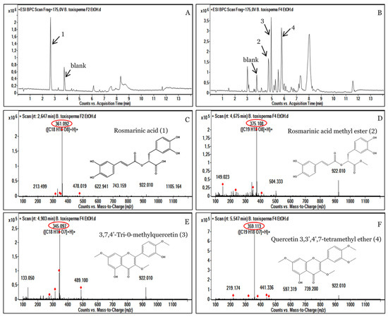 HPLC-UV-MS analyses of the active ethanolic fractions F2 (A) and F4 (B) of Baillonella toxisperma bark. Mass spectrum of [M+H]+ ions of rosmarinic acid (C); rosmarinic acid methyl ester (D); 3,7,4’,-trimethylquercetin (E) and quercetin 3,3’,4’,7-tetramethyl ether (F). The red circle represents the exact masses of the identified compounds.