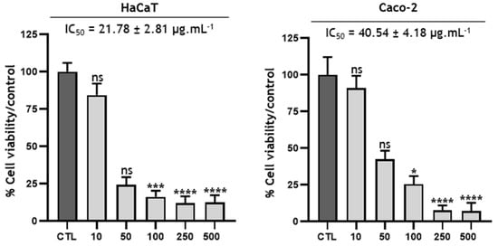 The objective of this activity was to evaluate the effect of Baillonella toxisperma bark on the overall cell proliferation of two cell lines: HaCaT and Caco-2. The cytotoxic assay was performed at different extract concentrations ranging from 10 to 500 µg/mL (Figure 5). The IC50 value was determined from the percentage of cell viability compared to the control. The results show that at up to 50 µg/mL, the B. toxisperma extract was well-tolerated by both cell lines. On the other hand, at 100 µg/mL onward, some toxicity was observed in both cell lines. Based on the different IC50 values, HaCaT cells seem to be more sensitive than Caco-2 cells, with respective IC50 values of 21.78 µg/mL and 40.54 µg/mL. These results seem very consistent not only with the traditional use of B. toxisperma but also with the different chemical groups found in the crude extract [49]. Indeed, phenolic compounds are known for their multiple properties: antimicrobial, antioxidant, antiapoptotic, anti-inflammatory and anticarcinogenic [50,51,52,53]. More specifically, certain compounds present in the bark of B. toxisperma, such as resveratrol, kelampayoside A, biochanin A and rosmarinic acid, are known to have various beneficial activities on the proliferations of several cell lines [54,55,56,57,58,59]. These compounds may therefore be partly responsible for the observed activity.