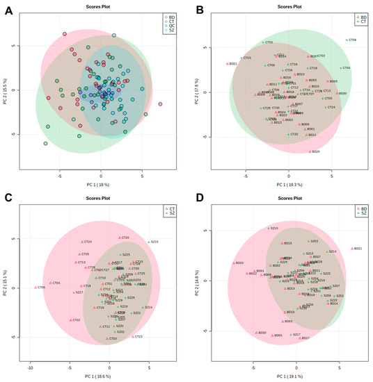 PC1 vs. PC2 scores plot from the PCA of: (A) CT, BD, and SZ groups with QCs; (B) BD×CT, (C) SZ×CT, and (D) BD×SZ.
