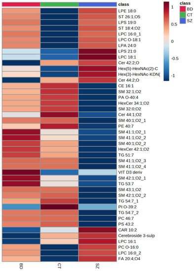 Figure 3 presents a heatmap of the comparison of the main lipid species across the studied groups, i.e., the lipids common among the three pairwise comparisons. Generally, the SZ group presented lower relative concentrations for most of the lipid species when compared to BD and CT. When evaluating the lipid species with a higher mean intensity in SZ than in the CT group, we observed that glycerophospholipids (GP), particularly LPC 16:0, sphingolipids (SP), such as glycosphingolipids and ceramides, several types of sterol lipids (ST), and fatty acids (FA) were on the top of the list. When examining those with a lower average intensity, most of the lipid species were SP, predominantly sphingomyelins; glycerolipids (GL), such as triacylglycerols, as well as some species of GP and ST. By contrast, SP presented lower average intensities for the BD group when compared to CT, alongside some FA species. Oppositely to SZ, the BD group presented higher average intensities for GL, such as triacylglycerides, and SP, mostly sphingomyelins, when compared to the CT group, as well as some species of GP, FA, and ST, such as a vitamin D3 derivative.
