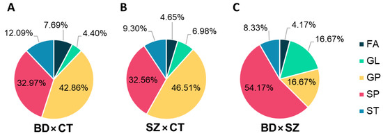 Distribution of lipid classes in the differential lipids identified for (A) BD×CT, (B) SZ×CT, and (C) BD×SZ comparisons. FA, fatty acyls; GL, glycerolipids; GP, glycerophospholipids; SP, sphingolipids; ST, sterol lipids.