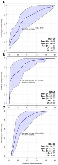 In order to assess if the putatively identified lipids could be considered potential biomarkers, multivariate ROC tests were performed, and the results are displayed in Figure 5. The BD×CT model (Figure 5A) presented an area under the curve (AUC) of 0.735 (0.552–0.895 with 95% confidence interval), 76.67% of sensitivity (Sens), 66.67% of specificity (Spec) and 71.67% of accuracy (Acc). SZ×CT model (Figure 5B) presented AUC = 0.865 (0.725–0.988 with 95% confidence interval), Sens = 83.33%, Spec = 73.33% and Acc = 78.33%. BD×SZ model (Figure 5C) presented AUC = 0.804 (0.615–0.981 with 95% confidence interval), Sens = 70%, Spec = 73.33% and Acc = 71.67%. Overall, all 3 ROC curves presented good AUC values (close to 1.000), with the SZ×CT model reaching 0.988 at the 95% confidence interval. The models also presented adequate Sens, Spec and Acc parameters.