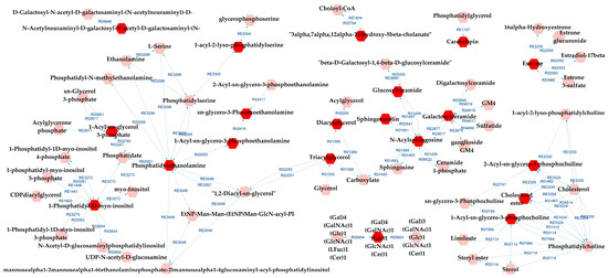 Differential lipids (DLs)-based metabolic network linked with potentially altered metabolic pathways between SZ and CT groups. The DLs are indicated by the bright red hexagons. Compounds in the pale red hexagons link the DLs with each other and/or show their relationship with a biochemical pathway to build the metabolic network.