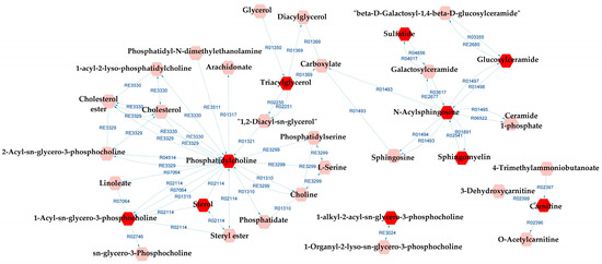 Differential lipids (DLs)-based metabolic network linked with potentially altered metabolic pathways between BD and CT groups. The DLs are indicated by the bright red hexagons. Compounds in the pale red hexagons link the DLs with each other and/or show their relationship with a biochemical pathway to build the metabolic network.