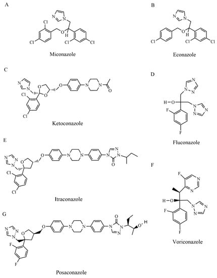 The molecular structures of azoles. (A) Miconazole, (B) Econazole, (C) Ketoconazole, (D) Fluconazole, (E) Itraconazole, (F) Voriconazole, (G) Posaconazole.