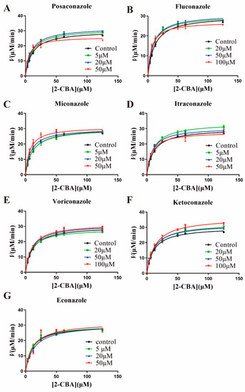 The Michaelis-Menten equation fittings of 2-CBA catalyzed by AKR7A2 in the absence or presence of azoles. (A). posaconazole, (B). fluconazole, (C). miconazole, (D). itraconazole, (E). voriconazole, (F). ketoconazole, (G). econazole. The steady-state kinetic measurements were repeated with at least three independent assays.