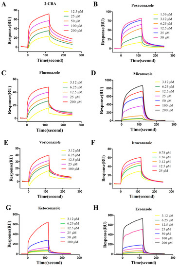 Representative binding sensorgrams for AKR7A2 with the compounds. The kinetic of AKR7A2 binding to 2-CBA (A), posaconazole (B), fluconazole (C), miconazole (D), voriconazole (E), itraconazole (F), ketoconazole (G), and econazole (H). The freshly purified AKR7A2 was covalently immobilized onto a CM5 sensor chip with ~20,000 RU. Different concentrations of compounds were injected at a flow rate of 30 µL/min. The data were fitted with a 1:1 binding model and gave the kinetic constants. All Biacore measurements were repeated with at least three independent experiments.