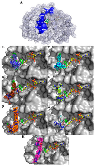 The binding area of the azoles on AKR7A2 predicted by blind docking. (A). The high-frequency binding area of azoles. Superposition of fourteen conformers of miconazole (B), nine conformers of econazole (C), eleven conformers of ketoconazole (D), nine conformers of fluconazole (E), eleven conformers of itraconazole (F), ten conformers of voriconazole (G), and seven conformers of posaconazole (H) at the entrance of substrate pocket. For the sake of clarity, residues 226–263 were not shown. Green: 2-CBA, yellow: NADPH. Color scheme: red for oxygen atoms, blue for nitrogen atoms, orange for phosphorus atoms, green for chlorine atoms, and light cyan for fluorine atoms. The figure was rendered with PyMOL [47].
