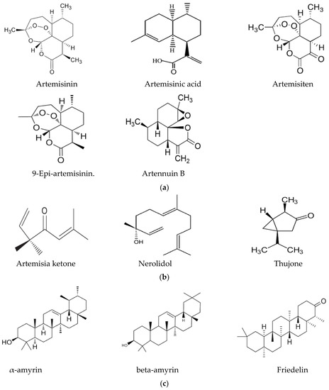 (a) Sesquiterpenes with direct anti-plasmodial activity. (b) Monoterpenes with direct anti-plasmodial activity. (c) Triterpenes with direct anti-plasmodial activity. (d) Polyphenols with direct anti-plasmodial activity.