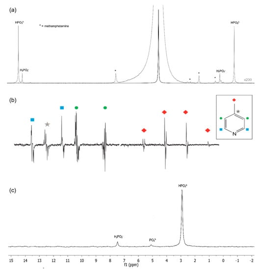 1D NMR spectra from different isotopes. (a) 1H (200× magnification) and (c) 31P NMR of Caustic Waste from Toluene Extraction of methamphetamine reaction. (b) 1D SABRE-hyperpolarized 13C NMR spectra of 4-methylpyridine with active SABRE catalyst and acquired following a 90°. NMR assignments from each non-equivalent carbon signals are highlighted by color and shape. Each carbon from the molecule has been assigned to Reproduced with permission from B. Bogun et al. [23] (a) &(c); and A. D. Robinson et al. [24] (b).