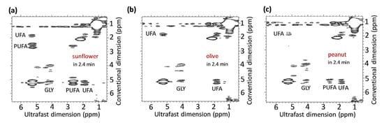 2D UF COSY spectra of sunflower (a), olive (b), and peanut (c) oil samples at 43 MHz. Assignments: relative concentration of glycerol (GLY), polyunsaturated fatty acids (PUFA) and unsaturated fatty acids (UFA). Reproduced with permission from B. Gouilleux et al. [31].