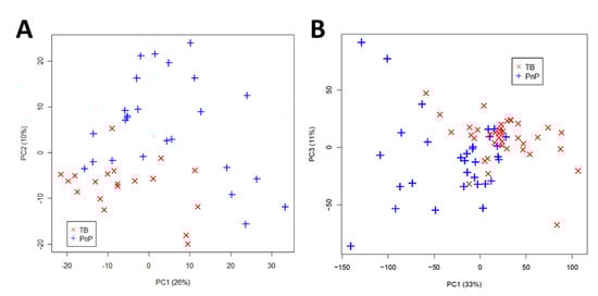 Principal Component Analysis (PCA) score plots of urine spectra analyzed by (A) HR-NMR of untreated TB patients (n = 19) and pneumococcal pneumonia patients (n = 25); (B) benchtop NMR of untreated TB patients (n = 39) and pneumococcal pneumonia patients (n = 31). TB, tuberculosis; PnP, pneumococcal pneumonia; PC, principal component. Reproduced with permission from J.L. Izquierdo-Garcia et al. [72].