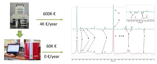 1H NMR spectra of urine samples from tuberculosis patients acquired by (top) 700 MHz Bruker NMR spectrometer, and (bottom) 80 MHz Magritek NMR spectrometer. Approximate purchase and maintenance costs of HR-NMR and benchtop NMR spectrometers are shown. Assignments: 1, 2-aminoadipic acid; 2, citrate; 3, creatinine; 4, creatine; 5, glucose; 6, mannitol; 7, hippurate; 8, phenylalanine. Reproduced with permission from J.L. Izquierdo-Garcia et al. [72].