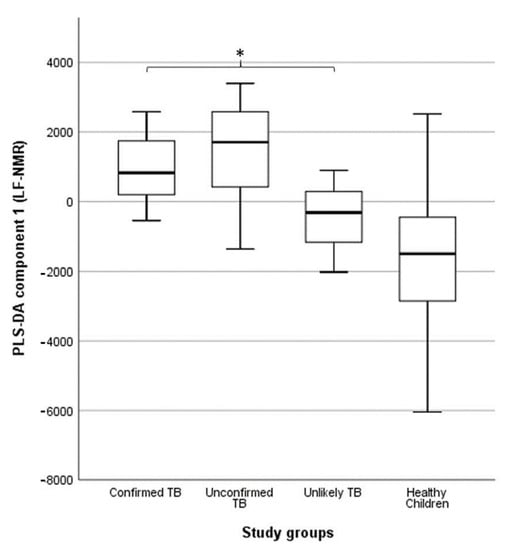 Association between partial least squares discriminant analysis (PLS-DA) scores and study groups in 109 urine spectra acquired by benchtop proton (1H) nuclear magnetic resonance. The central horizontal line within the boxes represents the median. The boxes comprise the first and third quartiles, the tiles indicate the maximum and minimum values, and the asterisk indicates statistically significant differences (p-value < 0.05) between groups. TB: tuberculosis. Reproduced with permission from P. Comella-del-Barrio et al. [73].