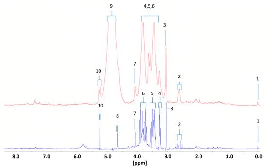 Diabetic urinary 1H NMR profile acquired with 60 (red) and 400 MHz (blue) NMR spectrometers. Assignments; ts: 1, TSP-Si(CH3)3; 2, Citrate-A/B-CH2CO2−; 3, Cn/Creatine > N-CH3; 4, β-Glucose-C2-H; 5, α- and β-Glucose-C4-H/C5-H, and α-Glucose-C2-H; 6, α- and β-Glucose-C3-H/C5-H/C6-H2; 7, Cn-CH2; 8, β-Glucose-C1-H; 9, H2O/HOD-OH; 10, α-Glucose-C1-H. Reproduced with permission from B.C. Percival et al. [21].