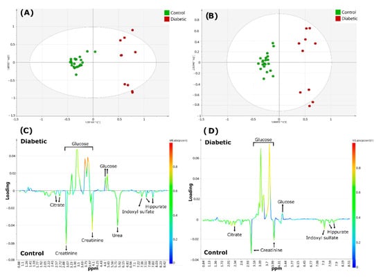 Metabolomics analysis of diabetics 1H NMR urinary profiles versus healthy controls acquired with 60 and 400 MHz NMR spectrometers. Scores plots (A,B), and corresponding loading-plots (C,D) from orthogonal partial-least squares discriminant analysis (OPLS-DA), data obtained using 400 (A,C) or 60 MHz (B,D) NMR spectrometers. The color of the signals in (C,D) correspond to the metabolites contributing most greatly towards the separation between diabetics and healthy control group samples. The color bar next to the right-hand side of these plots indicates the level of importance of the metabolites discriminating between classes and the colors represented more (red) or least (blue) significant metabolites. Reproduced with permission from J. Leenders et al. [82].