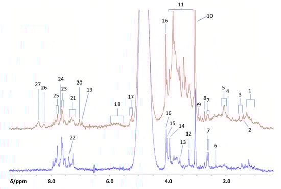 Benchtop 1H NMR analysis of type 2 diabetics and health controls urine samples. Profiles of diabetics (top, red) and healthy controls (bottom, blue) were acquired with a 60 MHz NMR spectrometer. Abbreviations: 1, branched-chain amino acid-CH3 functions (i.e., those of isoleucine, leucine and valine); 2, 3-D-hydroxybutyrate-CH3; 3, lactate-CH3; 4, acetate-CH3; 5, –NHCOCH3 functions of N-acetylsugars (free or present as side-chain residues in urinary N-acetylated glycoproteins) and/or N-acetylamino acids, e.g., N-acetylaspartate; 6, pyruvate-CH3; 7, citrate-CH2CO2; 8, dimethylamine-N(CH3)2; 9, dimethylglycine-N(CH3)2; 10, creatine/creatinine>N-CH3; 11, bulk-and-glucose C2H-C6H ring protons; 12, trimethylamine-N-oxide ON(CH3)3; 13, glycine-CH2; 14, guanidoacetate-NH-CH2-CO2; 15, creatine-CH2/hippurate-NH-CH2-CO2; 16, creatinine-NH-CH2-CO2; 17, -glucose-C1H; 18, urea-CO-NH2; 19, 3-(3-hydroxyphenyl)-3- hydroxypropanoate-C2H, C4H, C6H; 20, phenol-C2H, C4H, C6H; 21, indoxyl sulphate-C3H, C4H; 22, indoxyl sulphate = CH-NH−; 23, indoxyl sulphate-C2H/hippurate-C3H, C5H; 24, hippurate-C4H; 25, hippurate-C2H, C6H; 26, unassigned pyrimidine resonance, possibly hypoxanthine-CHs; 27, formate H-CO2. Reproduced with permission from M. Edgar et al. [79].