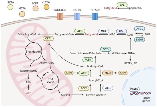 Cells obtain FAs via de novo lipogenesis and exogenous uptake (Figure 1). The entry of exogenous FAs from the surrounding microenvironment into cells is facilitated by specific transporters, including fatty acid translocase (FAT/CD36), fatty acid transport protein family (FATPs), and heart-type fatty acid-binding proteins (H-FABP) [].