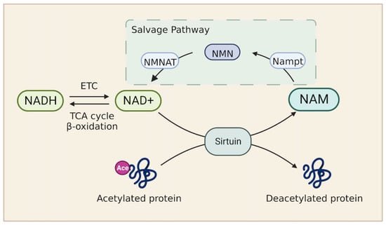Nicotinamide adenine dinucleotide (NAD) serves as the major electron carrier coenzyme in all three FAO stages. Initially, FAs undergo β-oxidation and remove successive two-carbon units to form acetyl-CoA. The formation of acetyl-CoA releases two pairs of electrons. NAD+ and FAD serve as electron acceptors and carry electrons in the form of NADH and FADH2. In the second stage, acetyl-CoA enters the TCA cycle to generate NADH and FADH2. Finally, NADH and FADH2 electron carriers produced in the above two stages donate electrons to the mitochondrial respiratory chain for ATP synthesis (Figure 1). Therefore, the NAD+/NADH redox pathway is critical for FA metabolism in patients with heart failure. A reduction in NAD or a decreased NAD+/NADH ratio is observed in patients with heart failure and in a murine model with pathologic hypertrophy [,]. Consistently, impaired expression of genes involved in NAD biosynthesis was confirmed in cardiac tissue from patients with ejection fraction preserved heart failure []. Mechanistically, a low level of NAD stimulates the hyperacetylation of mitochondrial proteins by inhibiting sirtuin, which impairs the cytosolic redox state and energy deficiency. Notably, the elevation of NAD+ levels by stimulating the nicotinamide phosphoribosyl transferase (Nampt)-dependent NAD+ salvage pathway or supplying NAD precursors improves cardiac function in response to stress (Figure 2) [,]. Furthermore, a clinical trial revealed that the administration of NAD precursor in patients with advanced heart failure enhances respiratory capacity through complex I activity in peripheral blood mononuclear cells and reduces proinflammatory cytokine gene expression [].