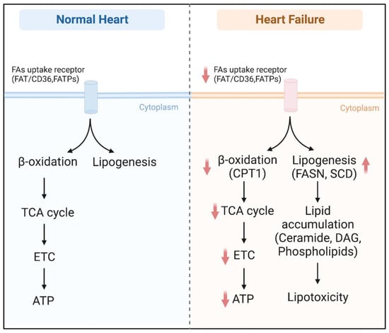 Overview of fatty acid metabolism in the normal heart and failing heart. Abbreviations: FAT/CD36, fatty acid translocase/cluster of differentiation 36; FATPs, fatty acid transport proteins; TCA cycle, tricarboxylic acid cycle; ETC, electron transport chain; ATP, adenosine triphosphate; FASN, fatty acid synthase; SCD, stearoyl-CoA desaturase; DAG, diacylglycerol.