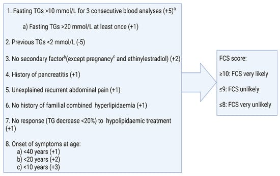 The difficulty in differentiating between FCS and MCS often results in the diagnosis of FCS being delayed. Some of the rapid biochemical tests to help differentiate between FCS and MCS, e.g., post-heparin LPL activity or lipoprotein electrophoresis, are also not readily available in clinical practice and measuring LPL activity is technically challenging. Moulin et al. proposed an eight-item scoring system to predict the likelihood of FCS []. The ability to identify FCS was tested in two independent cohorts using a cut-off score of 10 and yielded a sensitivity and specificity of 88% and 85%, respectively (Figure 2). It is interesting to note that in this score, body mass index (BMI) was not included despite data suggesting a greater prevalence of overweight and obesity in MCS as compared to FCS [,]. In a comparative analysis of an FCS and MCS cohort from two phase III clinical trials, volanesorsen and triglyceride levels in familial chylomicronaemia syndrome (APPROACH) and the efficacy and safety of volanesorsen in patients with multifactorial chylomicronaemia (COMPASS), BMI and a history of AP were reported to be the strongest predictors of FCS which, when used in conjunction with one of fasting LDL-C or apolipoprotein B100 (ApoB100), provides a sensitivity and specificity of above 90% []. A higher chylomicron-TG-to VLDL-TG-ratio (CM-TG/VLDL-TG) and TG-to-ApoB100 ratio (TG/ApoB100) were also found in the FCS cohort and, in fact, a CM-TG/VLDL value of 3.8 was found to be 100% sensitive and a value of 4.5 to be 100% specific in diagnosing FCS []. The addition of these biochemical markers to the eight items of the clinical score may enable a clinician to predict the likelihood of FCS and offer genetic tests to the appropriate cohort, particularly in resource-restricted settings.
