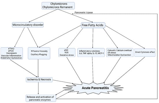 The exocrine pancreas is a rich source of pancreatic lipases that result in the hydrolysis of TG, resulting in the liberation of a large amount of free fatty acids that, once exceeding the binding capacity of albumin, leads to mitochondrial toxicity, oxidative stress, and creates proinflammatory milieu and acinar cell damage, culminating in pancreatic acinar necrosis. In addition, chylomicronaemia and free fatty acids via micelle formation increase the viscosity of blood and, thereby, impede the blood flow to the pancreas, leading to ischemia and worsening acidosis, which potentiates FFA-mediated acinar cell damage. A certain amount of pancreatic lipase, rather than entering the lumen of the gut, finds its way into the capillary circulation of the pancreas. Normally, this does not matter. However, when the pancreatic microcirculation is sluggish in chylomicronaemia, there is time for it to release fatty acids and lysolipids, which are cytotoxic [,,]. ER: endoplasmic reticulum; NO: nitric oxide; PGI2: prostacyclin I2; ROS: reactive oxygen species; TXA2: thromboxane A2.