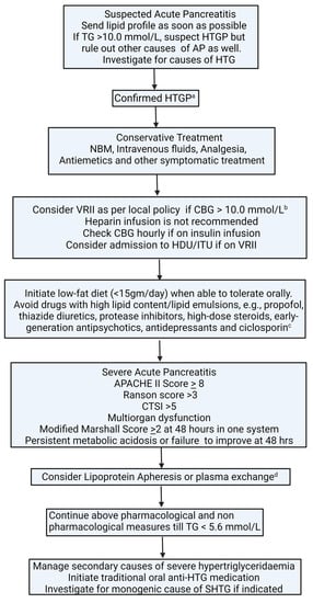 AP is the key clinical consideration in the acute presentation of SHTG. Despite this, there are currently no universally accepted guidelines for the management of HTGP and no established treatment target for TG lowering in the acute setting. The mainstay of treatment is to abort the supply of chylomicrons to the systemic circulation by either rendering the patient nil by mouth or with fat-free enteral or parenteral feed. However, in clinical practice, the severity of pancreatitis often leads to the consideration and institution of other interventions to rapidly reduce TG concentrations, i.e., insulin infusion or blood purification techniques (plasma exchange/lipoprotein apheresis, high-volume haemofiltration, haemoperfusion or double filtration plasma apheresis) at outset. Institution of interventional strategies in severe pancreatitis, in contrast to a more conservative approach in mild to moderate cases, has resulted in a selection bias and has confounded the outcomes of retrospective observational studies comparing clinical outcomes between different modalities. Interventional strategies have been advocated by certain experts in the context of severe pancreatitis to rapidly reverse hypertriglyceridaemia [,] and are deemed to improve the prognosis []. However, several recent small-scale retrospective studies have produced conflicting results, thereby not only challenging the notion of the utility of rapid TG reduction early but also the efficacy of invasive interventions in reducing TG rapidly [,,,]. The only randomized clinical trial comparing plasma exchange with insulin infusion in mild hypertriglyceridaemia-induced pancreatitis failed to demonstrate the superiority of either modality in rapidly reducing TG levels or clinical outcomes [] Similarly, high-volume haemofiltration has produced a significantly greater reduction in TG at 24 h; however, it was not found to yield superior clinical outcomes, that were comparable with insulin infusion despite a greater proportion of insulin infusion recipients having APACHE II scores ≥8 (67% (n = 34) vs. 53% (n = 32)) [].