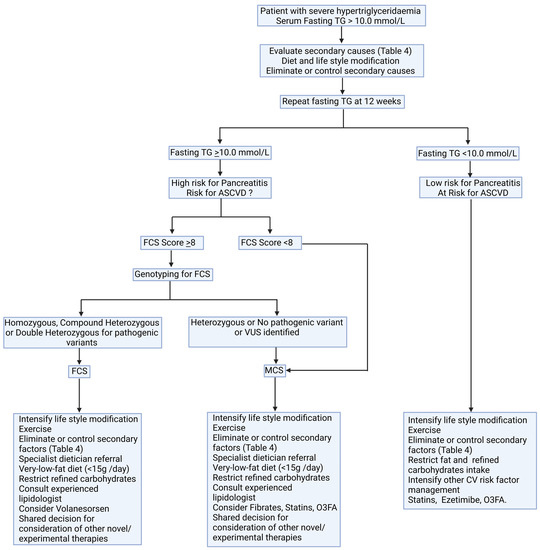 Low-fat diets and the elimination of secondary factors remain cornerstones in the management of SHTG. We propose a possible algorithm to approach a patient with SHTG (Figure 5). SHTG of monogenic origin is poorly responsive to conventional lipid-lowering therapy. Volanesorsen is the only pharmacological agent that has been approved by EMA and NICE for use in FCS. Several therapeutic agents in the experimental phases of use may be of utility in CS in future.